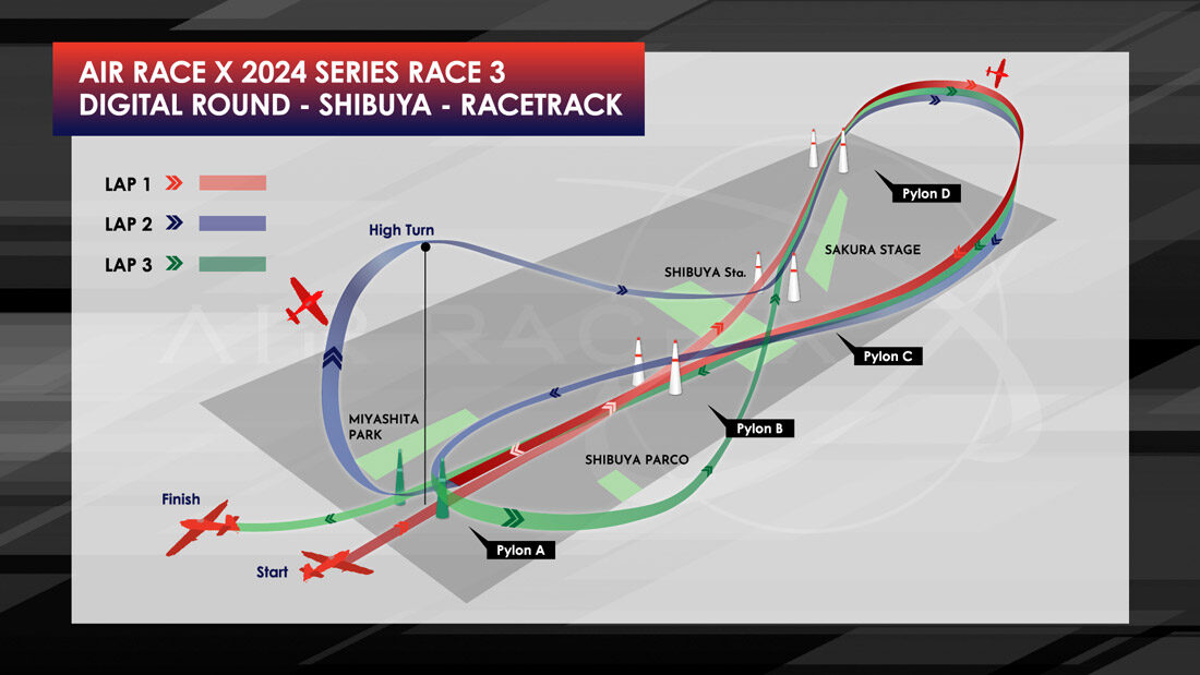 AIR RACE Xのデジタルラウンドが再び渋谷の街に帰ってきた。今回の渋谷デジタルラウンドでは、JR山手線の線路に沿うような形で4つのゲートが設定され、この間を往復しながら計14回通過するトラックレイアウトとなっている。