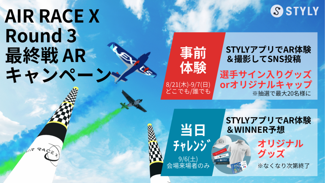 事前はSTYLYアプリでAR体験&SNS投稿キャンペーンに参加してスペシャルグッズをゲット。当日は会場で「WINNER(勝者)予想投票」に挑戦して、AIR RACE X オリジナルグッズを手に入れるチャンス。スマートフォンやタブレットで事前に体験し、会場でチャレンジする、2倍楽しい新しい観戦スタイルです。